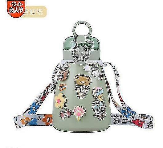 Kawaii Water Bottle with Straw and Big Belly Cup Insulated Cold Water Bottle with Kawaii Three-dimensional Stickers (500ml Green)
