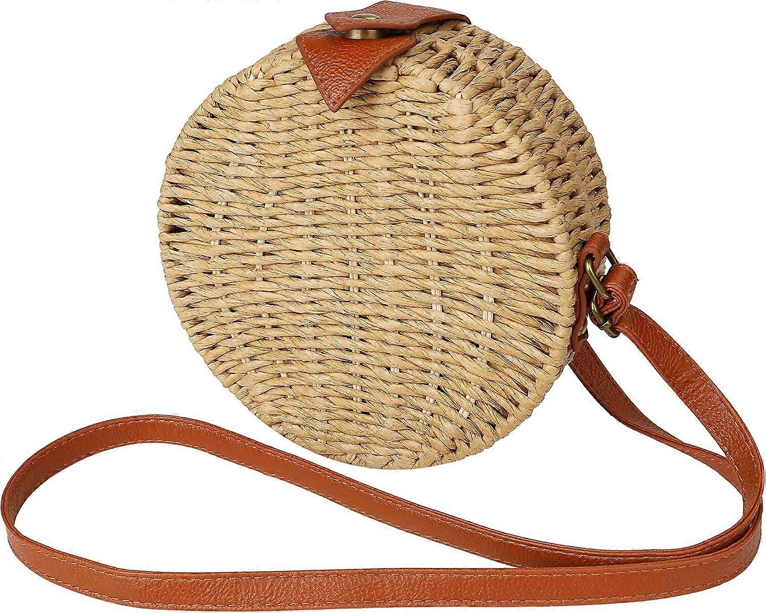 Straw Beach Bag Summer Round Vintage Handmade Crossbody Bag Circle Bohemian Shoulder Bag for Women Travel Vacation (Brown)