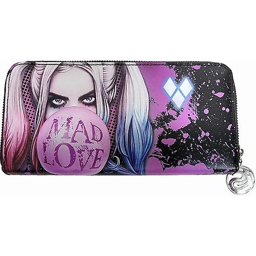 Material: Faux Leather, Polyurethane. Width: 21cm. Height: 10.5cm. Design: Bubblegum, Diamond, Paint Splatter, Printed, Text. Fastening: Zip. Branded Zip Pull. Compartments: 1 Internal Compartment, 1 Main Compartment, 8, Card Slot, Zipped. 100% Officially Licensed. Depth: 2.7cm. Characters: Harley Quinn.