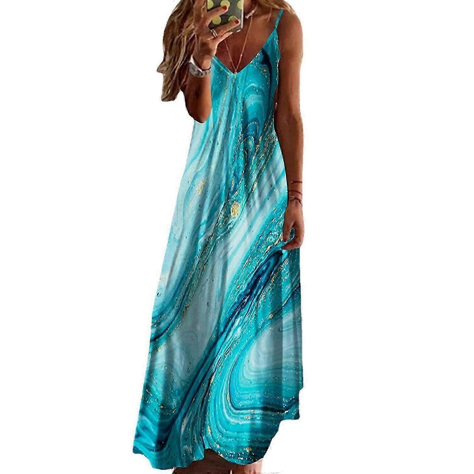 Flowy A-Line Dress with Spaghetti Straps - High Waist Casual Long Dress for Women, Loose Fit Floral Printed Summer Dress in Blue Size L