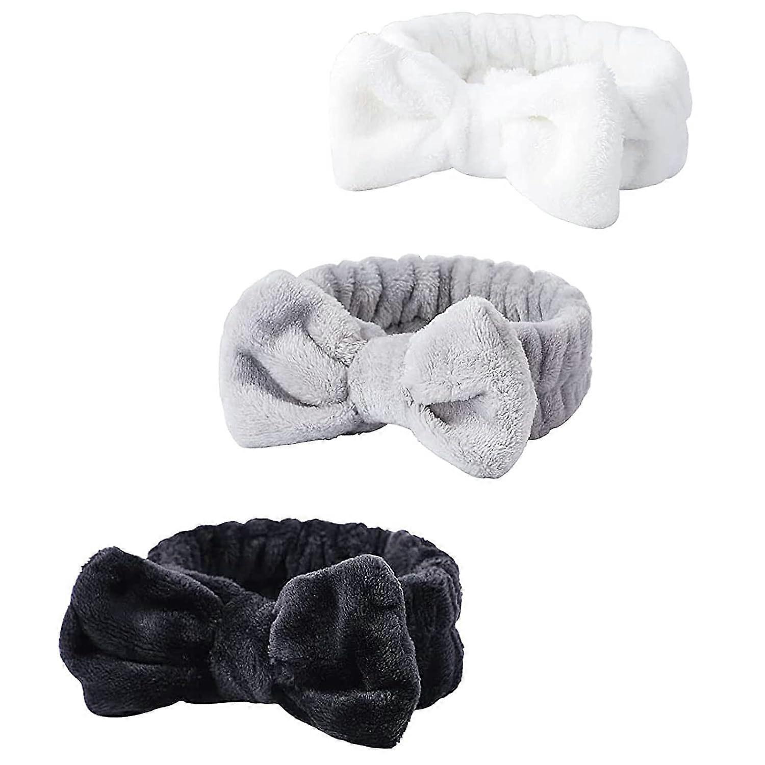 3Pcs Bow Hair Band: Youll get 3pcs washing face headband with beautiful classic color- white, gray, and black. This soft hair band is the best choice for bathing and washing face, help you keep hair away out of face . A good bath and keep face clean will put you in a good mood! Soft, Fluffy and Cushy: The cosmetic headband is 100% elastic microfiber fleece, ridiculously soft, comfortable, skin-friendly. And the makeup headbands are washable and reusable, ultra absorbent water, easy to wear. Each one is super adorable and cute! Good elastic and stretchable:The size is about 15.8inch , both suit for adult and kid, elastic strap good for stretch to 21.7inch, nice and tight around the head so it doesn't fall off of your head when wear it. Fashion Appearance: Adorable bow tie shape on the top of headband, makes you extraordinary sweet and cute. The bows themselves are not sew into the headband, so they are removable and can mix and match if that something you're interested in. Perfect Gift in Christmas: Great gift for girls and woman in festival! It's have cute appearance and practical functions, Suitable for making up and skin care, Perfect addition to your morning and nightly skincare routine! Would be great for teens girls birthday party treat or bachelorette/bridal party ladies sleep over party gift.