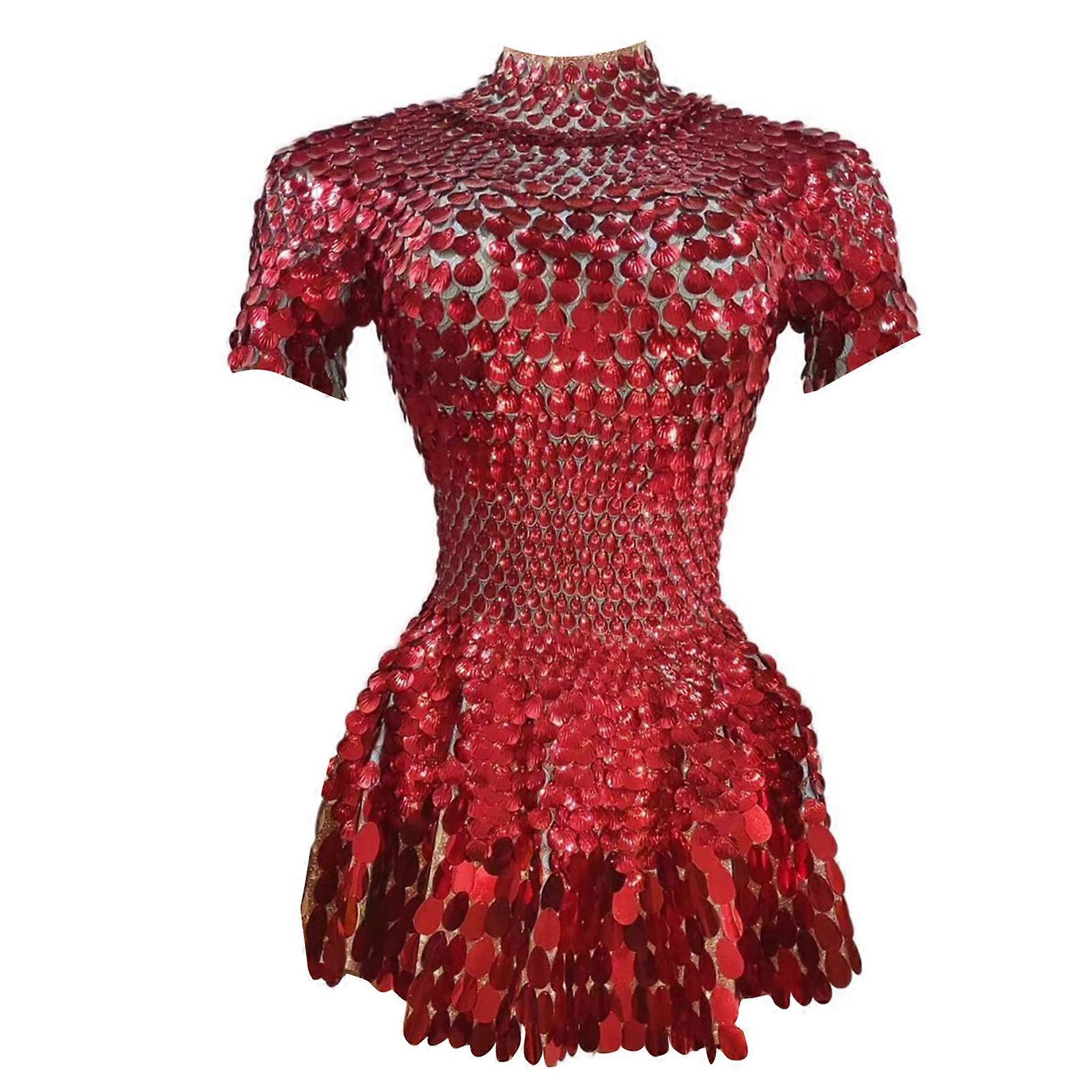 Sequined Performances Dress Short Sleeve Round Neck Mini Bodycon Dress for Professional Dancers and Party Goers Red S