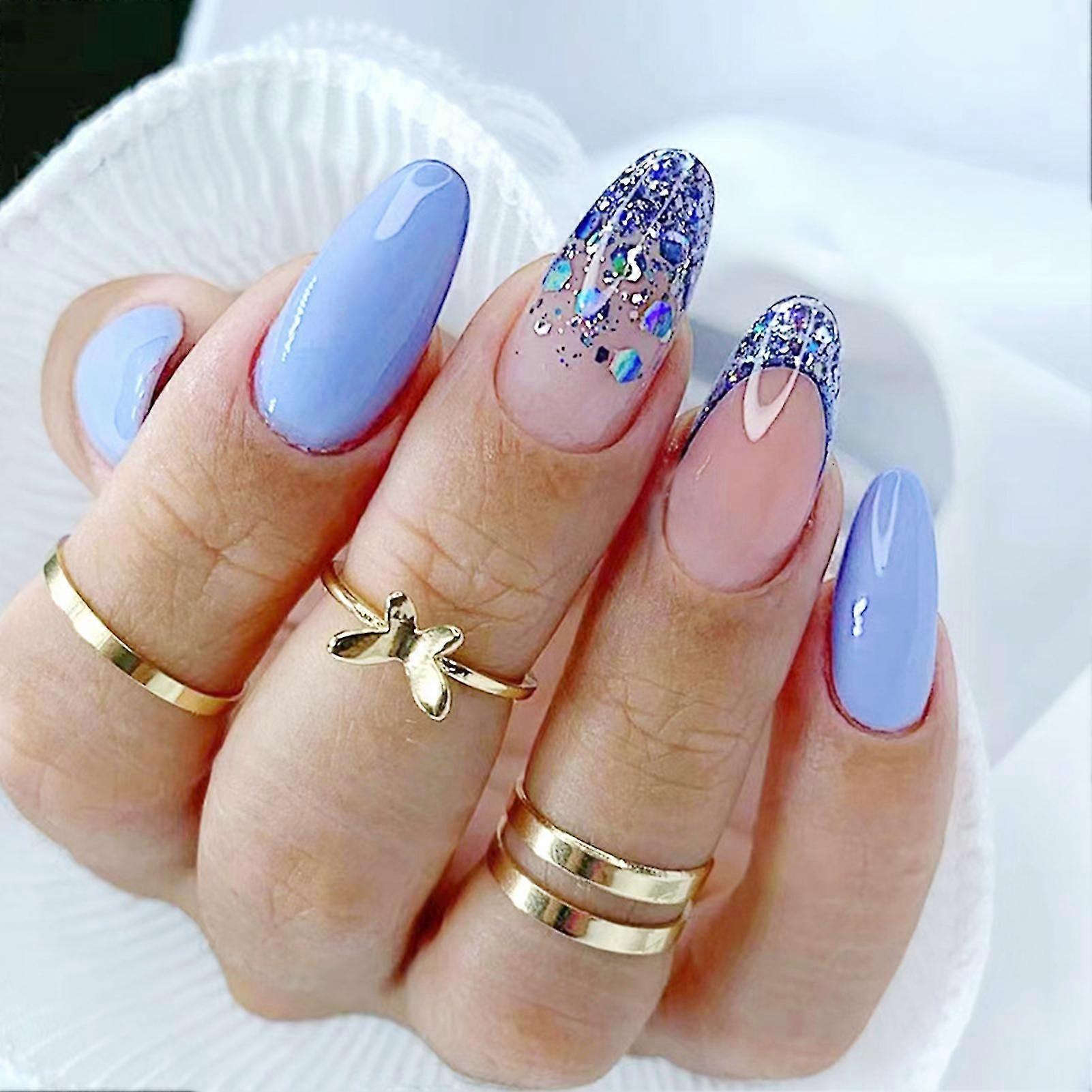 Sequin Painting Blue Almond Fake Nails Sweet Charming Reusable False Nails Jelly Glue Model