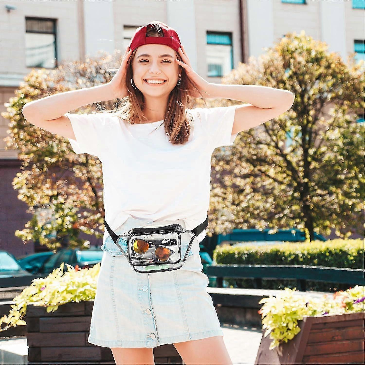 ROOMY SPACE WITH 2 SEPARATE POCKETS: Our bags are spacious enough to carry wallet, keys, card, cash, passport, etc. The front zip pocket especially fits well with your cellphone..CONVENIENT SEE-THROUGH DESIGN : With visual design, you can easily see the built-in items, allowing you to quickly pass through the security check. Easy access what you need often and keep organized..MATERIAL: The fashionable fanny pack are made of thick PVC material that holds its shape. With design, the waist pouch great for sandy beach or splashing pool..PORTABLE & LIGHTWEIGHT: 11 x 5.9 inches. Adjustable straps(19 to 47 inches) provide a comfortable fit for all sizes, and can be easily switched from a fanny pack to a crossbody sling bag..MULTI-PURPOSE: Ideal for any outing, used for various occasions at the beach, pool, water park, picnic, park, gym, boat, stadium, concert arena, sports game, and outdoor or water activities. Note: Due to the light and screen setting difference, the item's color may be slightly different from the pictures. Please allow slight dimension difference due to different manual measurement.