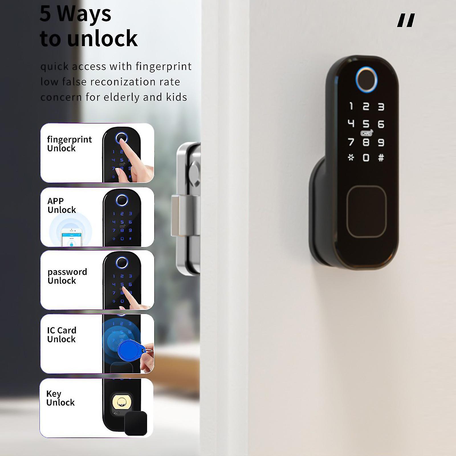 Smart Lock TechnologyConbines 5 keyless entry methods into 1 smart lock, FingerPrint, Passcode, RFID Card, Emergency Key, Mobile Application. Highly accurate fingerprint recognition, unlock the door within 0.3 seconds, and store up to 100 unique fingerprints.