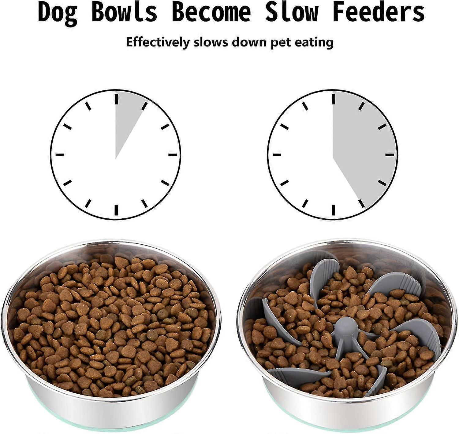 Ordinary dog bowls become slow eaters in seconds - Just press to attach slow feeder insert to the bottom of the dog bowl. The unique spiral blade and silicone nails design allows dogs to effectively slow down their eating; helping to reduce binge eating and reducing digestive disease in dogs.^Safe and healthy - Slow feeder insert is made of food-grade silicone, which is safe and soft. Unlike hard plastic, it will not damage your dog's nose during eating.^Strongest suction cup base - The 38 small suction cups on the bottom of slow feeder dog bowls are as strong as an octopus and hold it firmly in the bottom of the dog bowl without adding water.^Good practicality - Suitable for daily wet and dry food; best for dog bowls with a bottom diameter of 7-5.5"opening of 8.5-5.5 Inches and can be cut to fit a minimum of 4.7" dog bowls.^Easy to clean - No complicated and variable compartments, so dog slow feeder allows you to easily remove food residue whether by hand washing or machine washing.