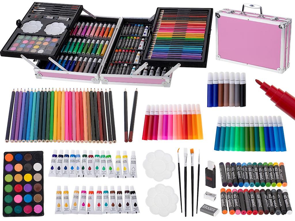 Super konst set för målning. En idealisk present till blivande konstnärer. Allt förpackat i en kompakt väska för enkel städning och transport. Färg: rosa. Setet innehåller: 145el. Labyrint längd: 8 cm. Boettmått: 34x23,5x8,5cm.