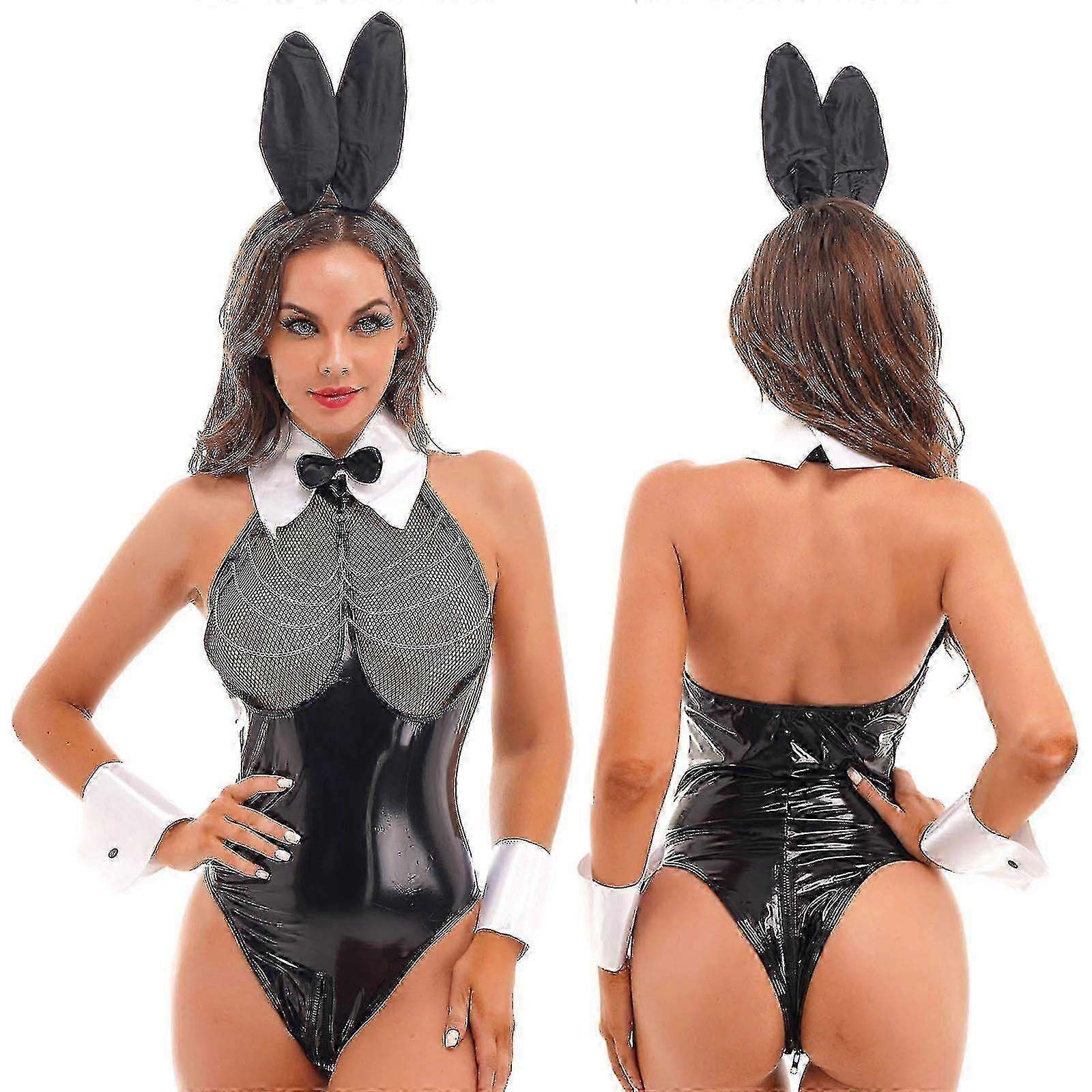 Sexy Cute Halloween Bunny Girl Cosplay Costume Faux Leather Rabbit Woman Set Mesh Chest Zipper Crotch Bodysuit Fancy Dress Up