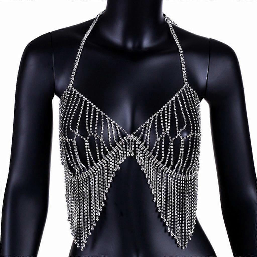 Sexy Crystal Rhinestones Body Jewelry Women's Fashion Bikini Chains Underwear Bra for Summer Beach Silver