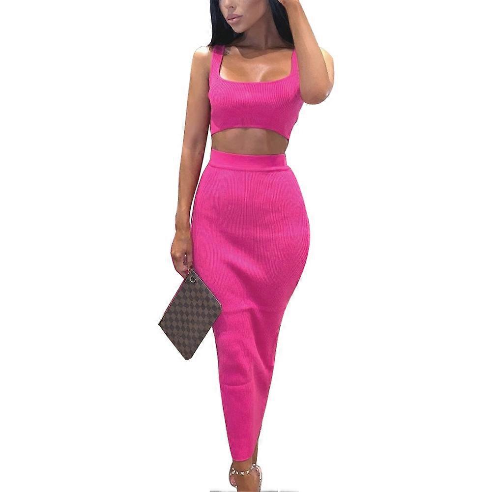 Sexy Summer Women Sleeveless Solid Color Round Collar Waistcoat Slim Dress Set (Rose Red XL)