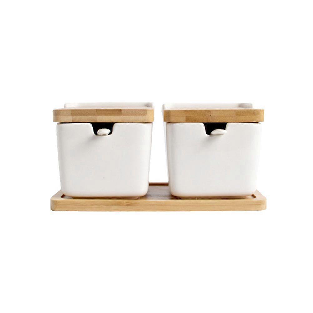 Ceramic Seasoning Bottle Condiment Storage Container Square Shape with Base Holder and Spoons for Kitchen Use 2Set