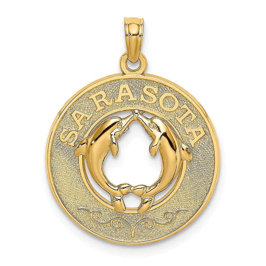 14k Gold Sarasota Round Frame With Dolphins In Center Charm 24.1x19.2mm Wide 2.7mm Thick Pendant Necklace for Women
