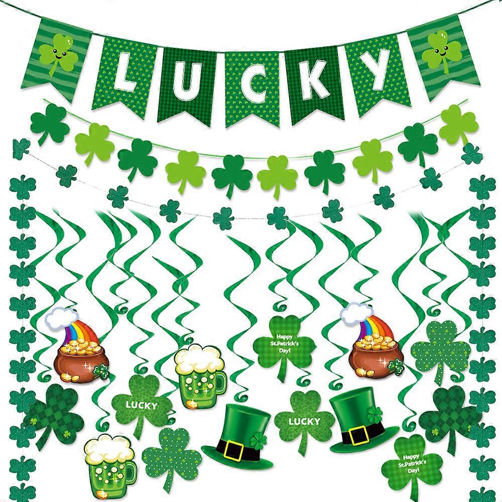 Irish Day Decoration, Creative Shamrock, Happy Disposable Household Paper Made from paper material, eco-friendly and perfect for decorating. Easy to use - hanging swirls are attached with string and plastic hooks. The shamrock string is easy to hang and remove. Shamrock cutouts are attached to the swirls. The clover wreath is easy to tie. Assorted designs: includes not only clover swirls, but also leprechaun hats, beer, rainbows, gold pots, lucky coins and more. Perfect for adding St Patrick's Day cheer to windows, ceilings, arches, classrooms, clubs, bars, shops, parties and offices! Colour: Green Size chart. Pull Flag 20*14CM, Shamrock 11*12CM, Spiral Card (Leaf 14.5*16CM, Beer 12*16CM, Hat 19*16CM, Rainbow Gold Coin 10.5*15.5CM) Set include: 1 set of swallowtail flags 1 set of dark green and light green clovers 3 sets of glitter clover pulling 3 sets of 14 pieces of spiral Package includes. 1 set of Irish Day party decorations Notes. 1. Please allow for slight errors due to manual measurements. 2. Due to the difference between different monitors, the image may not reflect the actual colour of the item. 3. Happy online shopping!