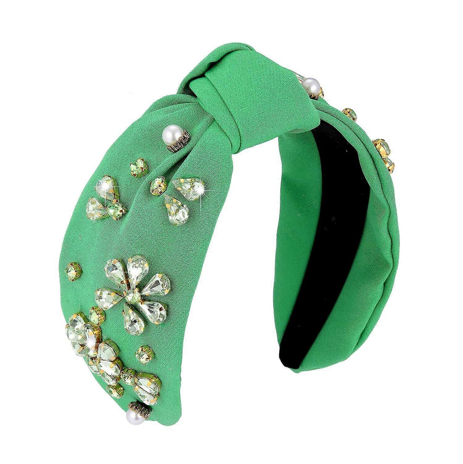 St Patricks Day Headband Rhinestone Flower Embellished Knontted Wide Turban