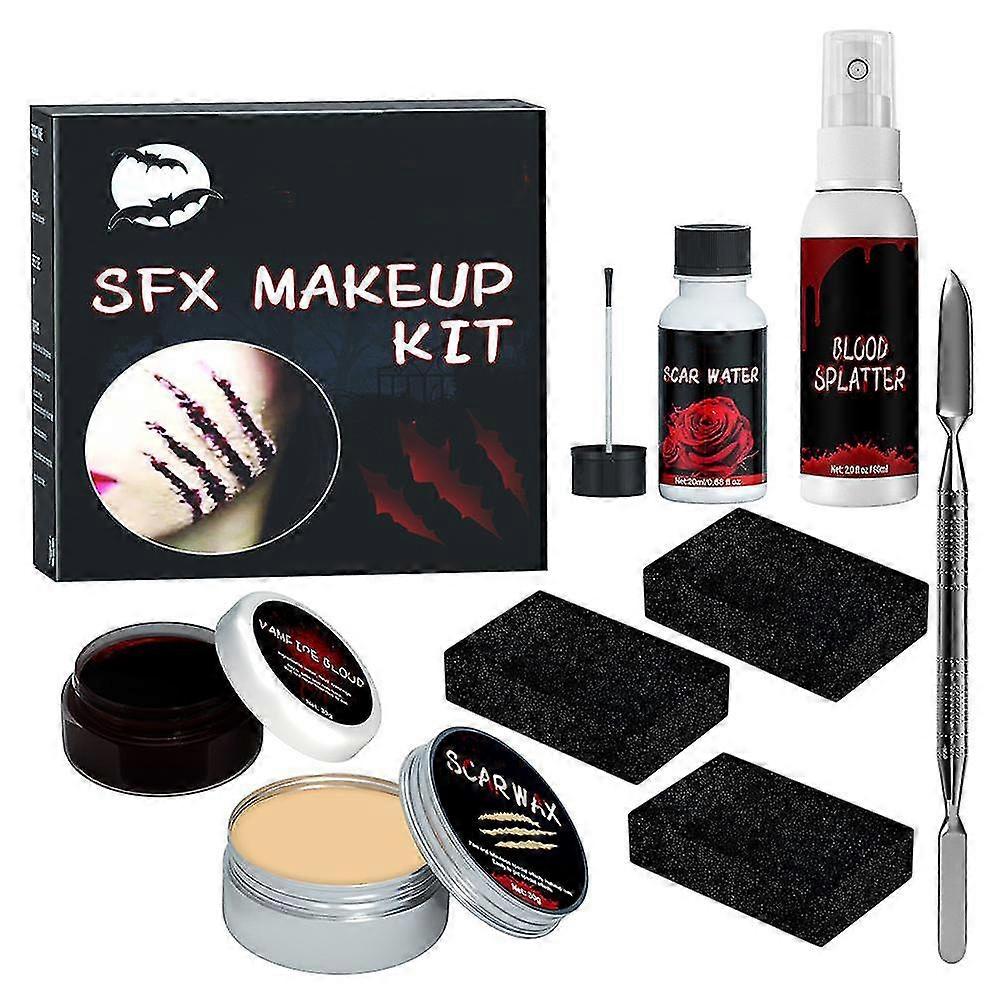 Halloween Special Effects SFX Makeup Kit for Zombie Vampire Skin Wax Fake Blood Gel Scar Water Fake Blood Spray Sponge Silver Scraper for Halloween C