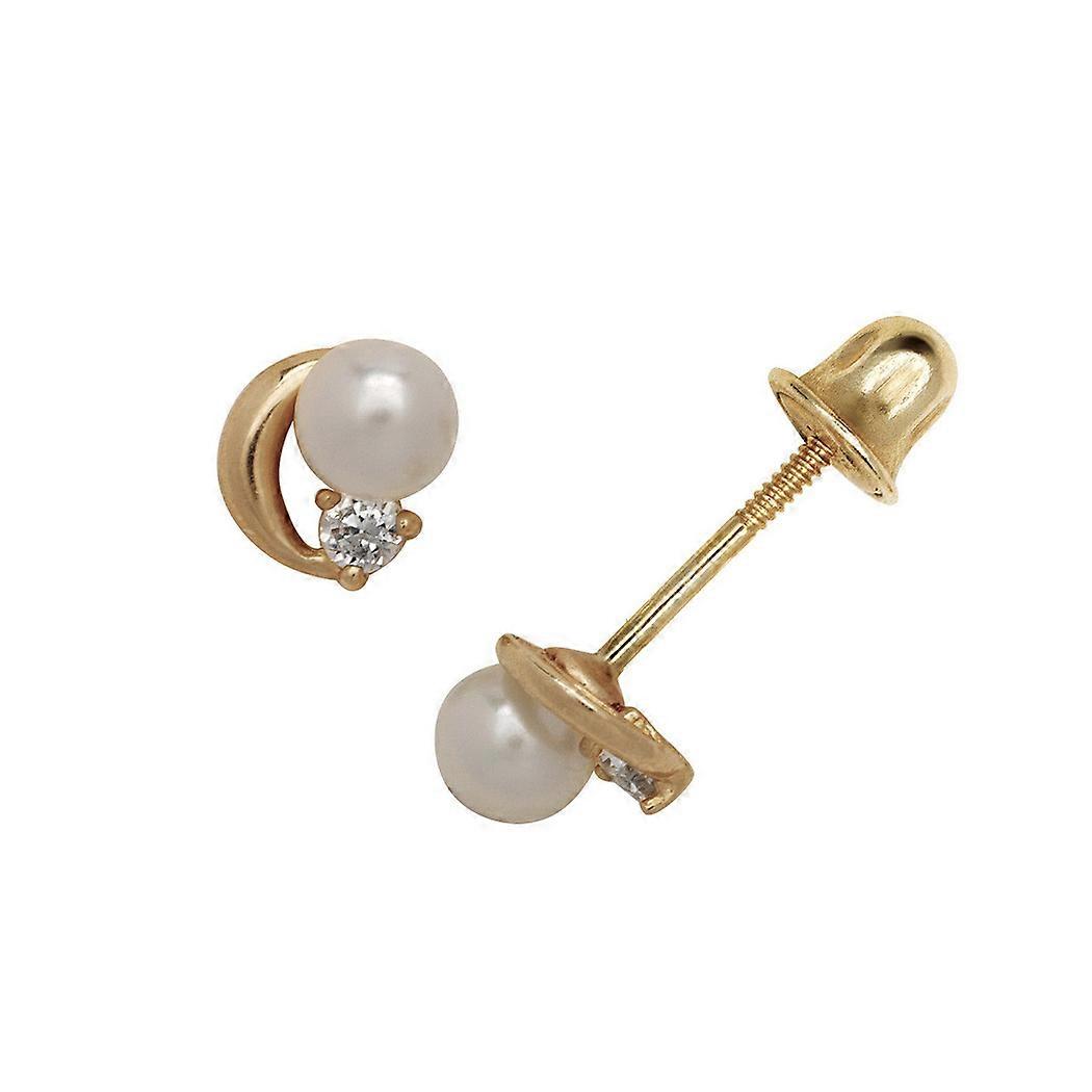 Solid 14k Yellow Gold Small 5mm Crescent Celestial Moon CZ and FW Pearl Screw Back Stud Earrings (3 Color)-Stud Earring