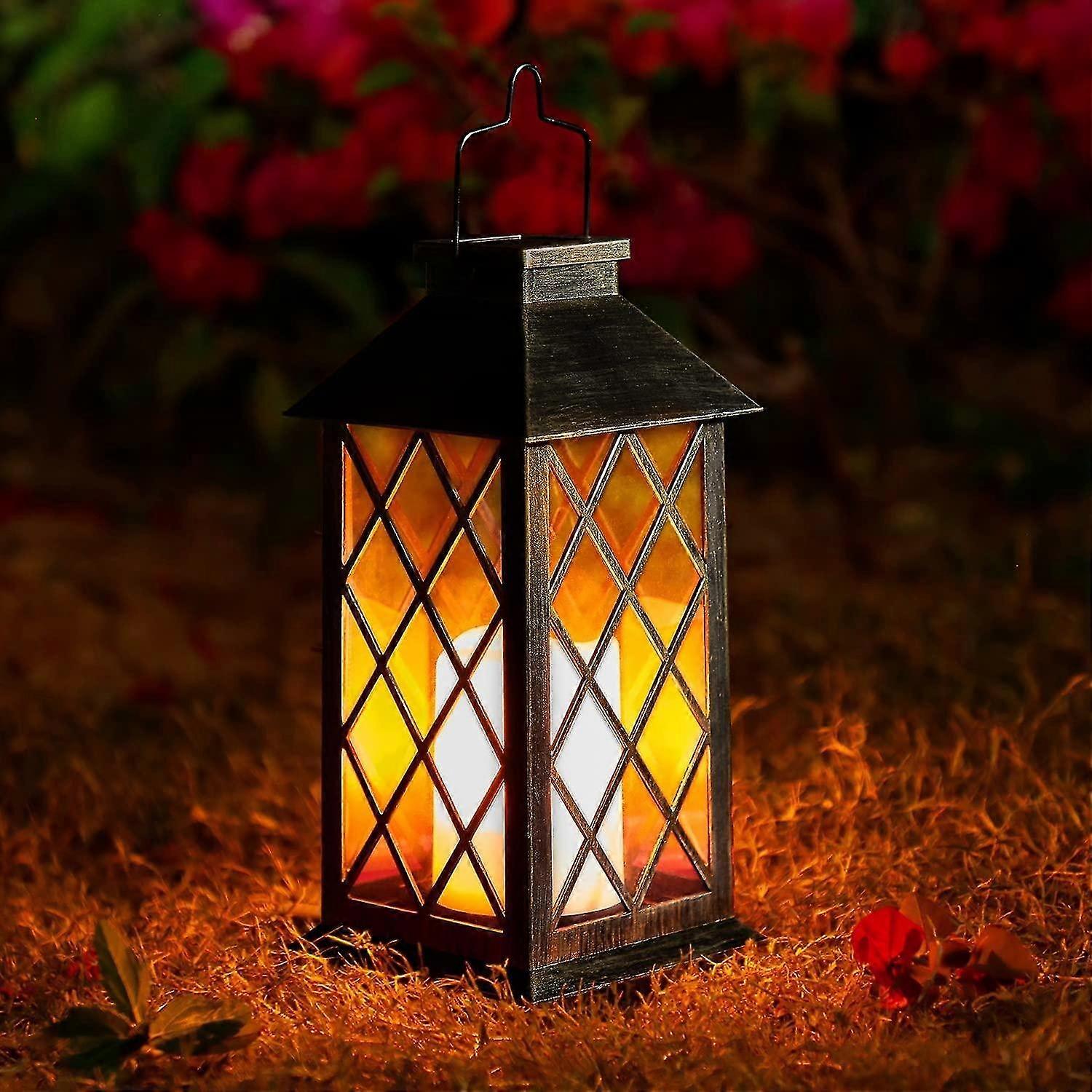 A wonderful decoration: Enjoy your home and surround yourself with things that create joy Classically designed with a very realistic and twinkling amber LED candle, this retro and stylish solar lantern is a perfect decoration for your garden, patio, yard, driveway, porch, lawn and more. Energy efficient and environmentally friendly: Powered by solar energy, these flashing solar garden lights are energy efficient and environmentally friendly. The solar panel absorbs sunlight during the day, converts it into electrical energy at night, and charges a 600mAh rechargeable NiMH battery. Auto On/Off: Thanks to the built-in photocell sensor that detects light, it automatically turns on at dusk and off at dawn. Charging 8 hours a day in direct sunlight can illuminate up to 6-8 hours. (The brightness of solar items depends on the duration of daylight and its intensity). Easy to install: Even if you are relatively new to outdoor solar lantern, don't worry about the installation The solar light is easy e and you can hang it or place it wherever you want. Durable and anti-rust: Your solar light is built to last Made from upgraded plastic and glass materials, it is IP44 waterproof, more hard and weather resistant. Even in harsh environments, it can also work normally.