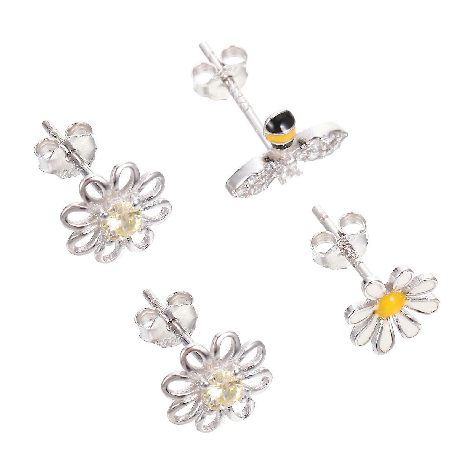 Solar Flower Ear Studs Sterling Silver Bee Earrings Studs for Women 2Pairs