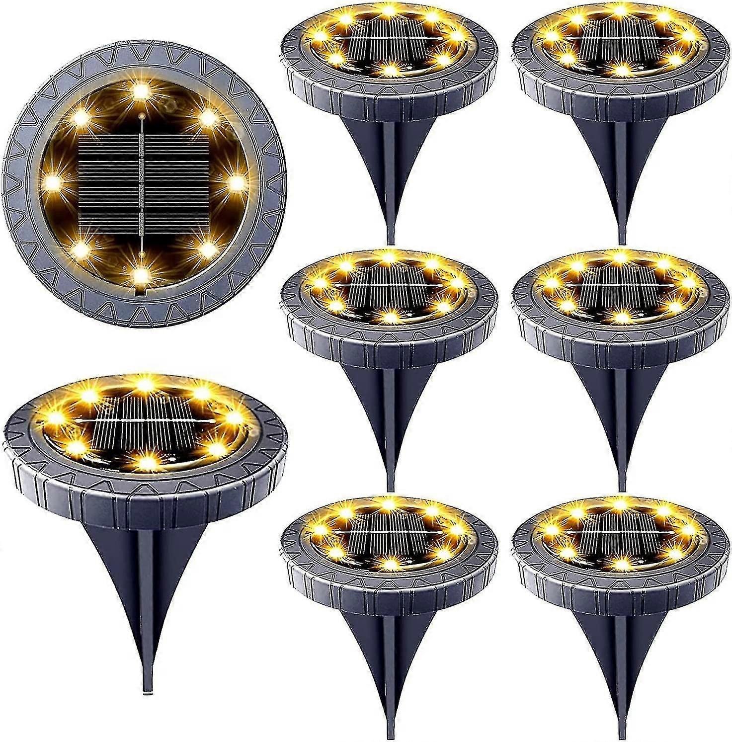 Upgrade Premium Materialsclassic disc-shaped garden lights solar powered waterproof uses thickened and corrosion-resistant ABS material that is resistant to pressure and scratch,which means the outdoor solar path lights will not be damaged even themower run over it,it's more durable than stainless and no metal rust.Solar lawn lights are designed as IP68 Waterproof and strudy ABS cover with 8 screws for long-lasting use even if exposure to weather like snow,rain and frost. Free solar energy solar energy,solar powered path lights outdoor use larger monocrystalline silicon solar panels and 600mah replaceable batteries with strong power storage capacity,which can efficiently collect and store solar energy even in rainy.it means the solar ground lights outdoor charged for 4-8 hours during the day and automatically lit up for 10-13 hours,outdoor solar yard lights have 8 premium LED provide wider and brighter lighting all night,It's incredible energy-economy Creative Design & Gift IdeaThese maintenance-free solar pathway lights outdoor are flush with ground and don't need to take it out when using a mower.solar walkway lights outdoor will automatically charge in daytime, turn on at dusk and turn offat dawn, which effectively saving the workforce and no need pay expensive electricity bills.LED Solar bionic lights are also ideal gifts for housewarming and gardening,It's also most surprise gift for your family and friends to decorate the courtyard. Easy to Installoutdoor solar disk lights are ideal for hassle free illumination and outdoor temporary yard lighting,no tool and wiring are required,just peel off the plastic film and turn on the switch on the back, you can put the outdoor garden solarlights on the flat deck or install solar disc lights with stakes in a flowerbed where you frequently dig without worrying about damaging electrical wires and worrying about your dog chewing through or tripping on electrical wires.