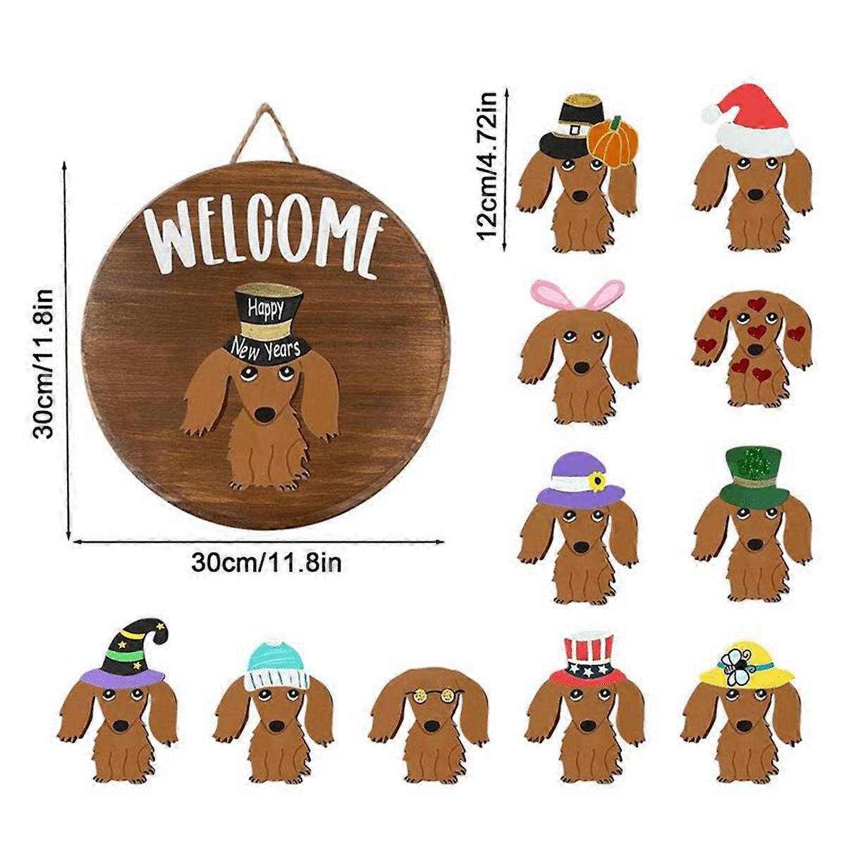 Dachshund Seasonal Welcome Sign for Front Door Rustic Round Wood Wreaths Sausage Dog Wall Hanging Home Decor