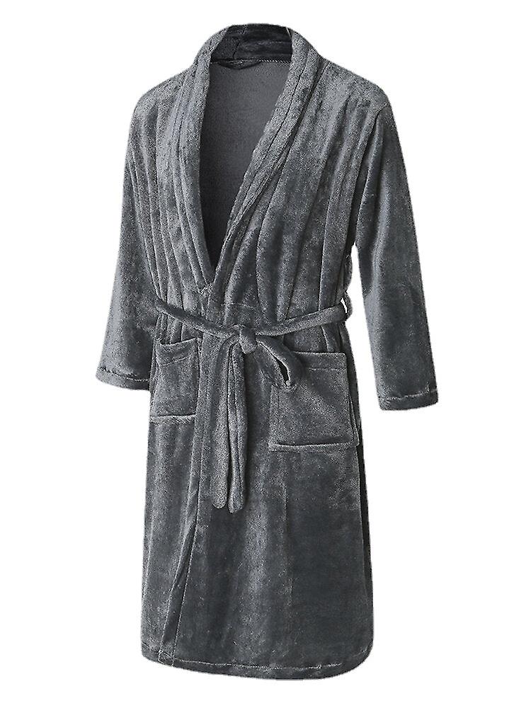 Men's Solid Color Flannel Robe With Double Pockets And Sashes - Thick Home Sleepwear