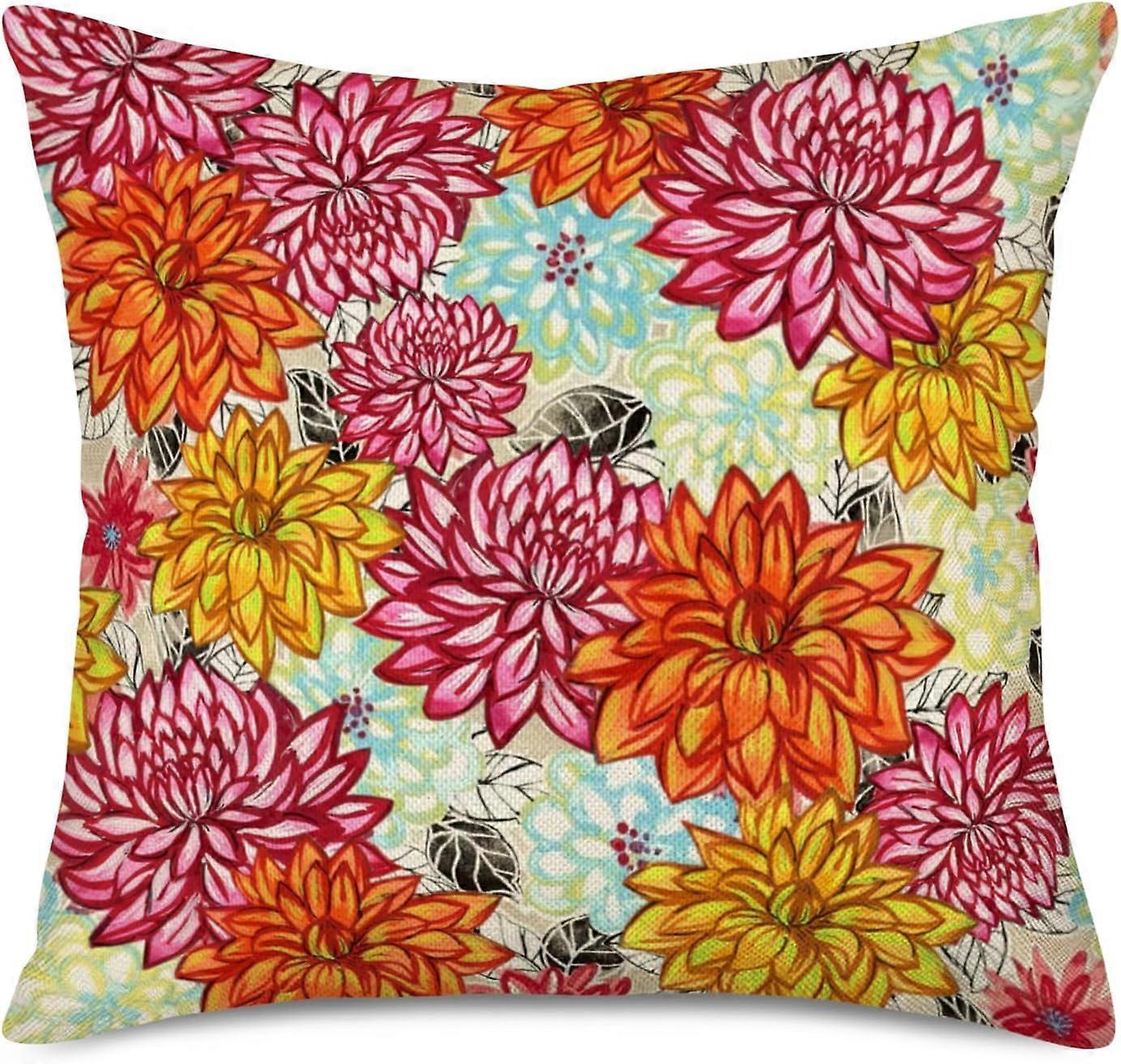 Dahlia Flower Pillow Covers Cotton Linen Colorful Floral Leaves Watercolor Throw Pillow Cases 20x20 Inch Square Home Decor Cushion Cover for Sofa Couc