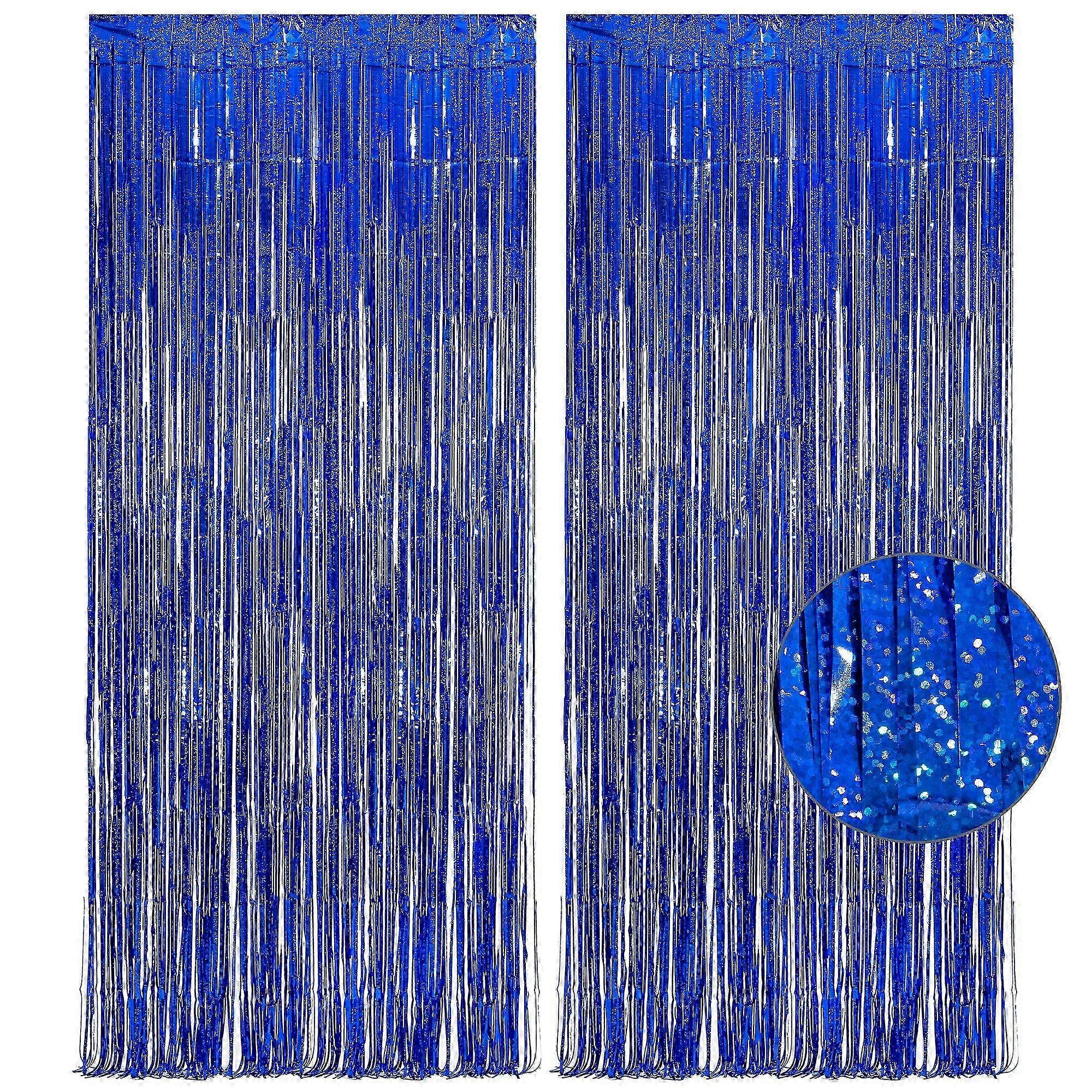 8.2ft x 3.2ft dark blue foil fringe curtains 2-pack, this dark blue tinsel foil fringe curtains can make your party atmosphere fuller and more enjoyable. Suitable for many occasions: This dark blue foil fringe backdrop curtain is a party decoration curtain, suitable for cosplay party, ocean world decoration, blue sky theme decoration, birthday party for men, bachelorette party, baby shower party, bridal shower, engagement ceremony, wedding, photo booth backdrops, graduation party. Flashing sequin backdrop can enrich your visual experience and enjoy a better atmosphere. With this rain curtain as the foil curtain backdrop party decoration, you and your friends and family can sing and dance, and you will have an unforgettable party! How to use: This foil fringe curtain is easy to stick, there is double-sided tape on the back of the rain curtain, you can tear off the tape behind this dark blue foil curtain, and directly stick the sticker on it for the needs for party occasions, if you want a better effect, let your imagination run wild! Glue on the double-layer party fringe curtain or even the multi-layer curtain backdrop for party, try different colors to form a patchwork color difference, resulting in a better visual impact, you can also arrange some light blue balloons and banners, a pair of blue color-themed party can be formed. It's also easy to take off after a party, won't damage the walls, and can be used again. Material: The material of dark blue foil fringe backdrop curtain is PET foil, which is a foil streamer. It is a tassel rectangle, soft to the touch, and the color has laser sequins, which is bright and full. Notes: In order to make the foil curtain stronger, you can stick several layers with your own tape, which will keep it longer.
