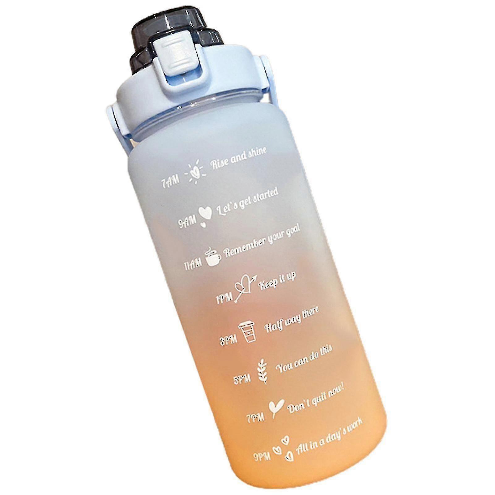 DescriptionFeatures:1. Material: Made of quality PP, PC and silicone materials. Stable, food-grade and does not harm health. Light weight with a portable wrist strap makes it convenient for on-the-go hydration.2. Flip Top Lid: The lid and the cup are connected together to prevent the lid from falling during exercise or walking. More convenient and sanitary.3. With Straw: This design is conducive to sports such as cycling or trail running. Silicone materials made, soft and safe for human.4. Time Marker: Always too busy and forget to rehydrate the body in time? Our water bottle has a design that reminds you to drink water. Put it on your table and you will never forget to drink water.5. Gradient Color: There are always a lot of water bottles in the gym, afraid of taking the wrong one? With our gradient color design, you can recognize your own among many water bottles at a glance.Notice:Actual color may be slightly different from the image due to different monitor and light effect.Please allow 1-3cm deviation due to manual measurement.Description:Material: PP, PC and siliconeSize: 30*11cmCapacity: 2000ml/70ozTemperature resistance: 0 to 80 degrees CelsiusColor/Style: As the picture shownincludes:choice 1: 1 x Sports Water Bottlechoice 2: 1 x Sports Water Bottle, 1 sheet of sticker(random style), 4 x 3D sticker