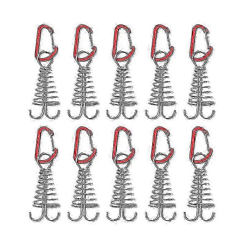 Stability and durability: Made of aluminum alloy and stainless steel material, it is not easy to deformation, corrosion resistance, and durable.Non-slip and adjustable: Comes with a spring buckle to help better secure the tent stakes and prevent the ground stakes from falling or rotating due to the collapse of the tent. It's easy to get the rope in place, adjust the length of the rope, and secure the tent.Easy to install and remove: When you mount the tent on a board with space for a camping area, all you have to do is put it into the crack and rotate to secure it. It can be installed without damaging the circuit board. It works better in combination with carabiners.For Bridges and shafts, tents and roofs can be installed and fixed on the deck or shaft during outdoor camping.Portable: Small and light, suitable for outdoor activities. It has 10 curtain rods with buckles.vrslMaterial: Aluminum alloy and stainless steelSpring size: About 10.5x3.5cm or 4.13x1.37in < br >< br > Carabiner size: close to 2.5x4cm or 0.98x1.57inColor: WhiteQuantity :10Pcs Note: Due to the light and screen setting difference, the item's color may be slightly different from the pictures. Please allow slight dimension difference due to different manual measurement.