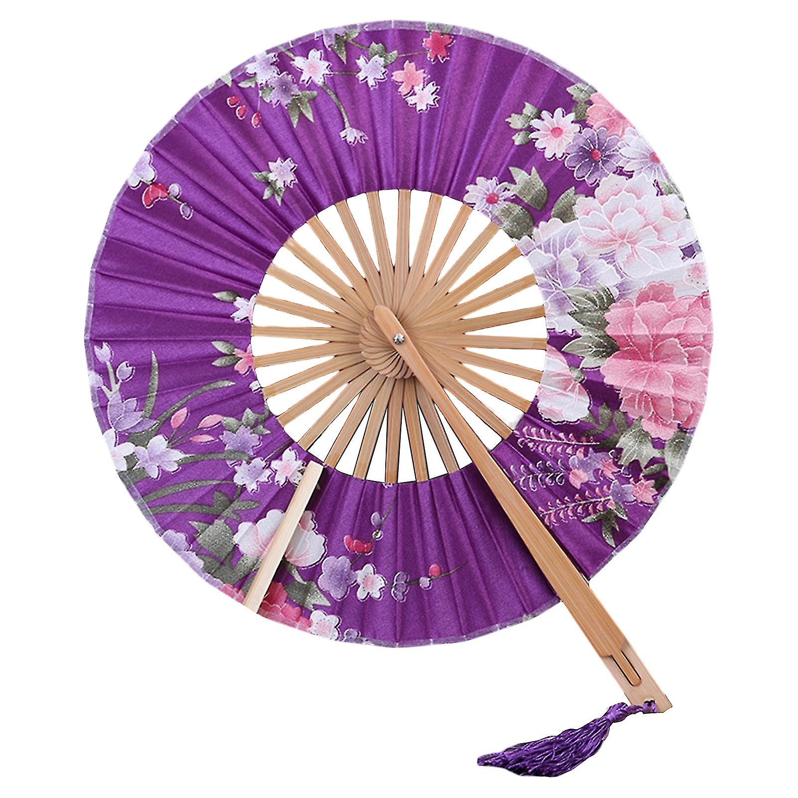 Ancient Classic Hand Fan With Tassel Dress Up Costume Bamboo Flower Print Round Fan Performance Supplies