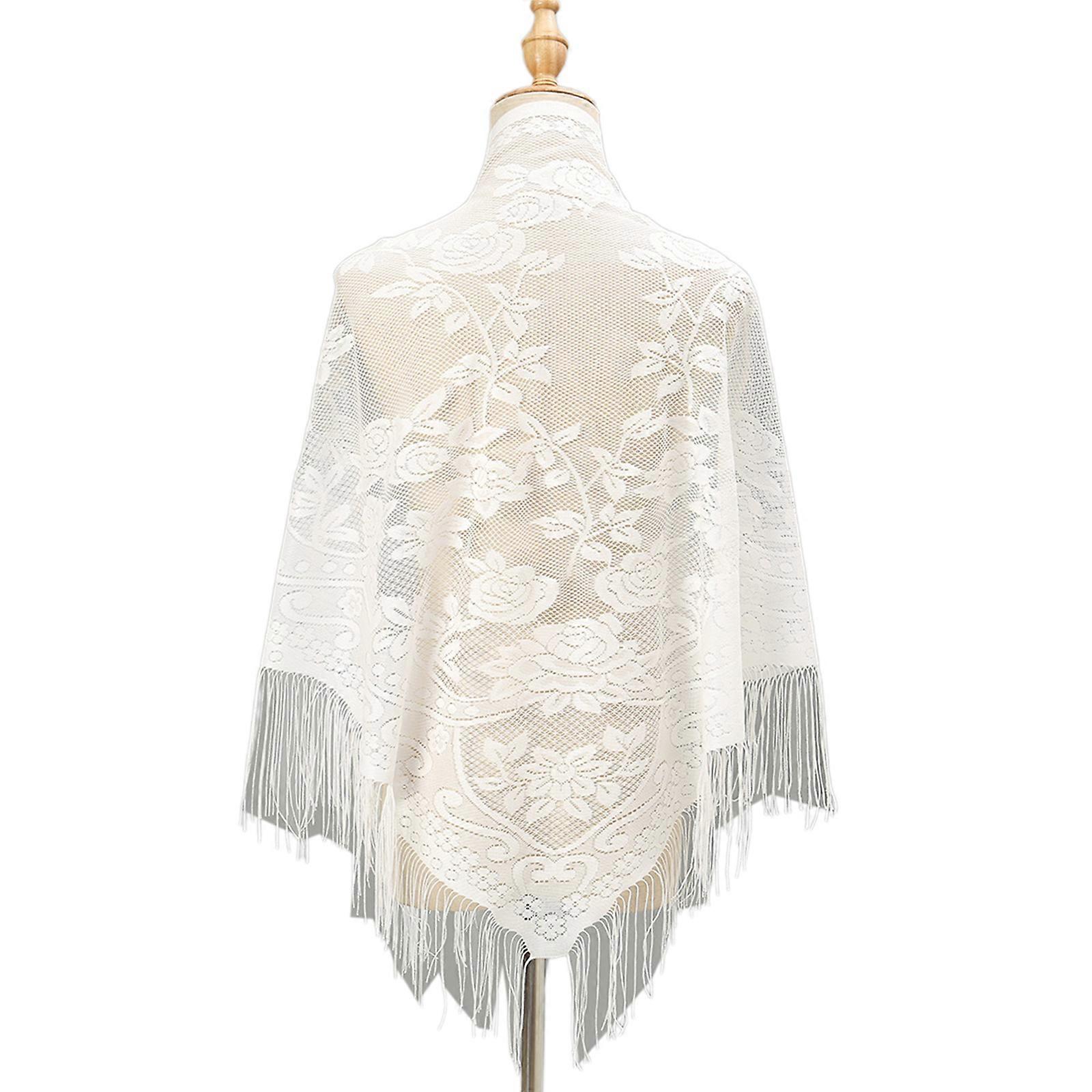 All Matching Lace Shawl Wrap with Tassels Sheer Triangular Shoulder Wrap Cover Up Scarf for Women Formal Casual Occasion White