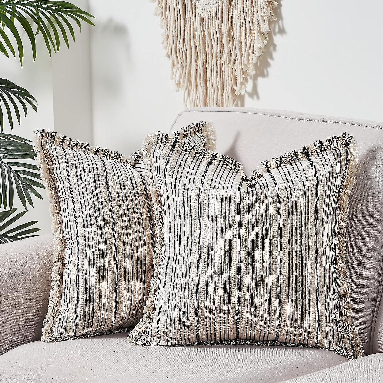 Farmhouse Throw Pillow Covers With Tassels 18x18 Inches Set Of 2, Modern Stripes Decorative Fringed Cushion Cases, Black And White Boho Textured Linen