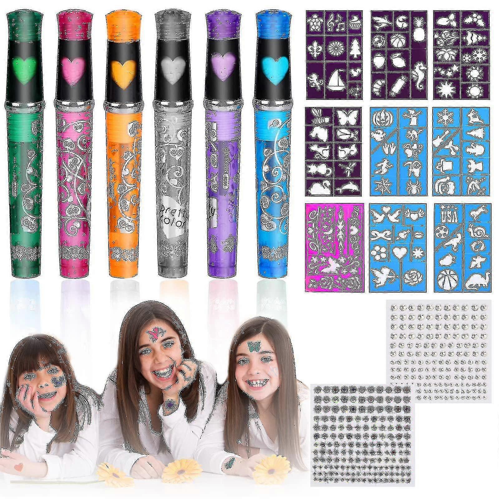 Tattoo Pens Kids 6 Glitter Colors, Tattoo Gel Pens With 8 Stencils 80 Patterns + Face Gem, Tattoo Pens Set For Boys Girls Halloween Party Dress Up Xi