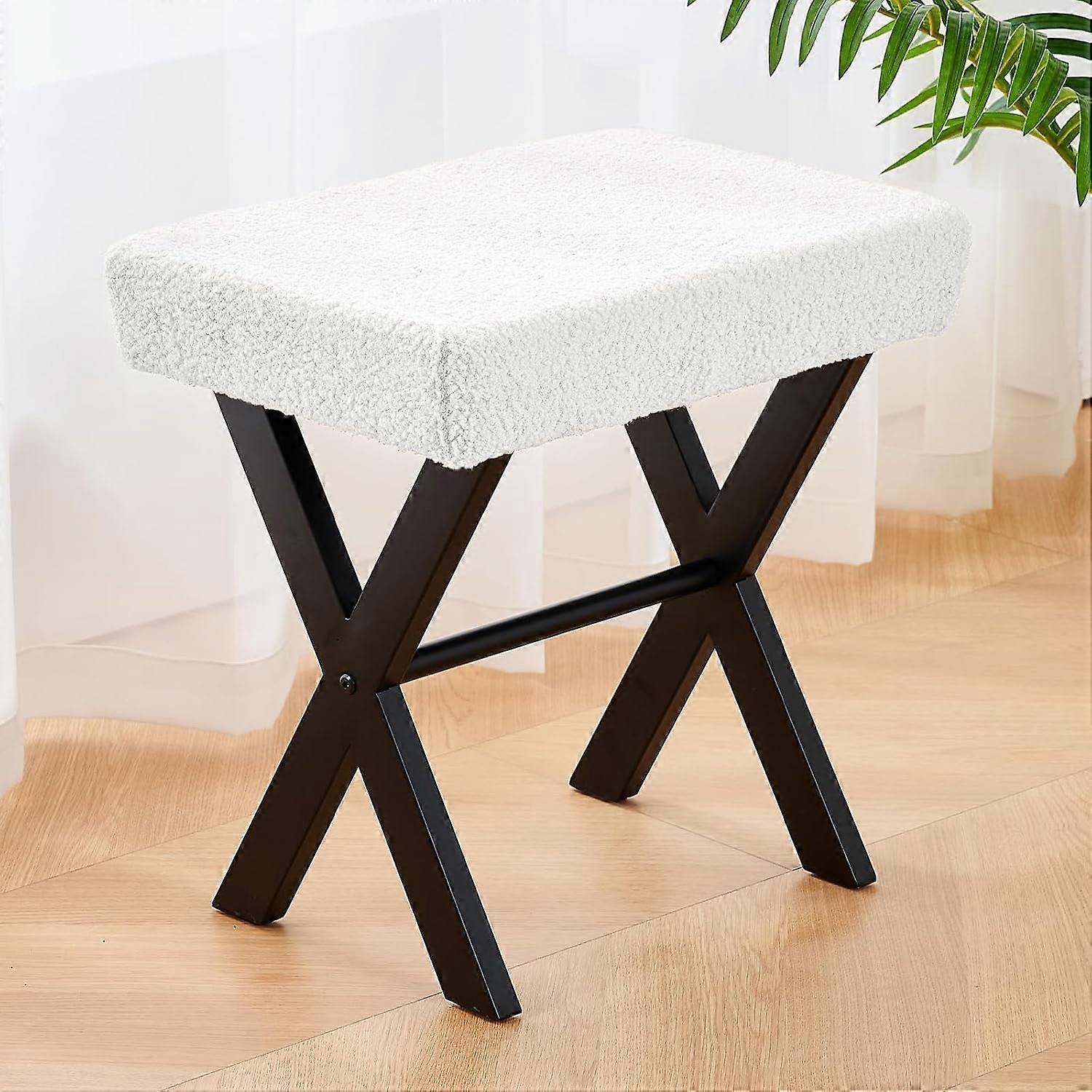 Tufted Footstool with Metal X Leg, Thick Cushion Shoe Changing Seat for Living Room Bedroom, Faux Leather Black