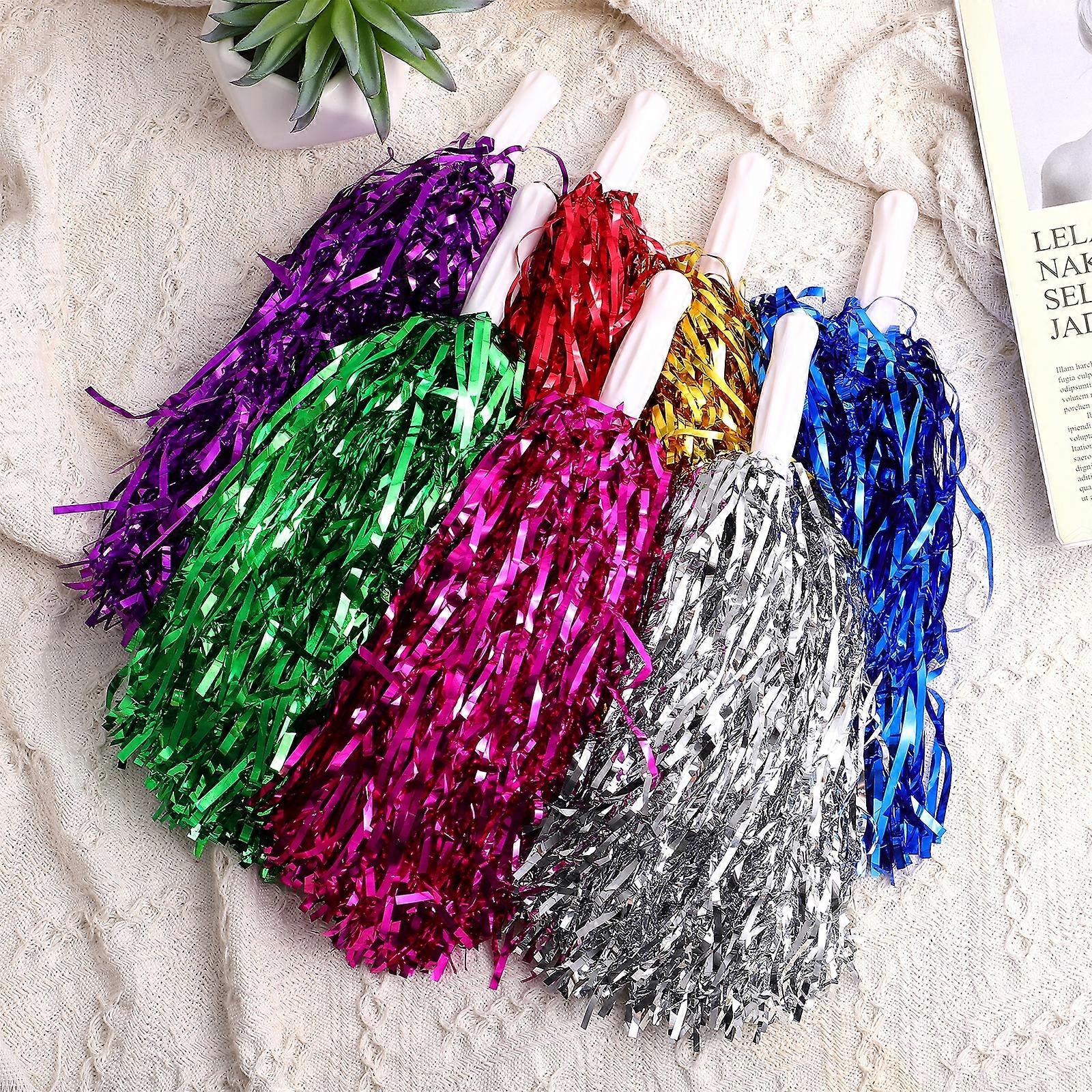 cheerleaders poms Made of superior quality metallic foil of bright and shinning colors, they are very firmly attached to the plastic handle and not easy to fall off while using. The handle is smooth and comfortable which makes the pompoms very easy to hold. Perfect for cheering squads, players, matches, parties, dancers, audience and party decorations. cheering squad pom poms Brand: NUOBESTY. Color: Mixed Color. Material: Plastic, metallic foil. Size: About 30.00X2.00X2.00cm/11.79X0.79X0.79in A great addition to the sports events or other parties. metallic foil pom poms Made of plastic as well as metallic foil, safe, wellmade and durable. Thanks to the plastic handles, it is very easy to hold them. Can serve as great accessories for a lot of events. For example, sports games like soccer, basketball, baseball, softball, hockey, tennis, etc. They are suitable for kids, teenagers and adult cheerleaders. Package including 14 x NUOBESTY Cheerleader Pom Poms