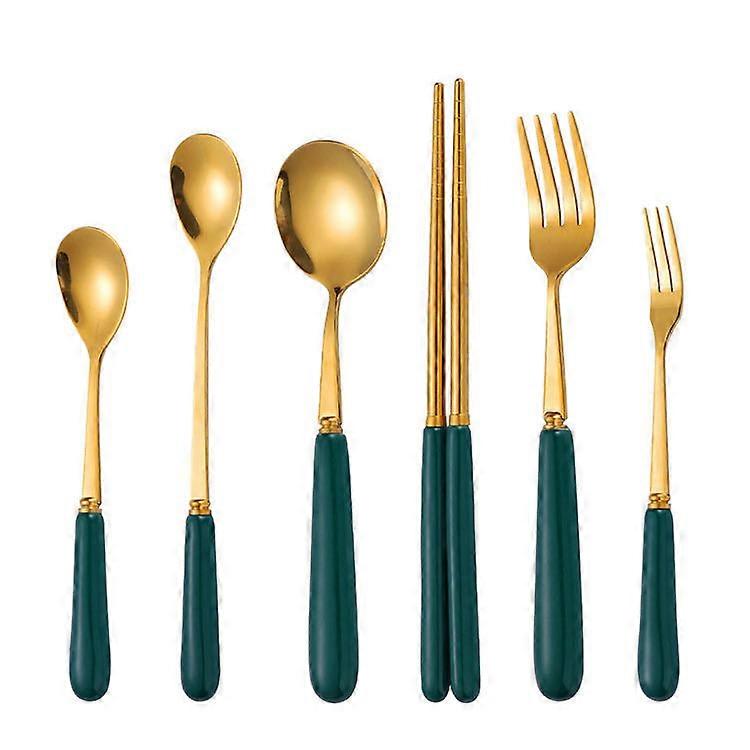 XIANQI Product Description: Quantity: 1set Color: green HEALTHIER TITANIUM PLATED STAINLESS STEEL Made of premium stainless steel suitable for flatware production. No worry about color fading or chipping as its a titanium metal layer that comes from Vacuum Electroplating technology; Titanium is non-toxic, radiation-free, rust resistant, corrosion-resistant, wear-resistant, and good biological affinity. FULL OF ORIGINALITY DESIGNSimple and elegant design,no pattern can match any occasion. The handle is made of ceramic material with uniform and warm color, so it has excellent heat insulation and scald resistance. Mirror Finish enhancing the look and style of your meals. DURABLE HIGH QUALITYThis flatware set has high hardness, no distortion, durable construction. The mirror polished surface always keep shining and easy to wash. The smooth edges have no rough spots and the handle is comfortable to hold. WIDE RANGE OF APPLICATIONSThis cutlery set is ideal for family, party, office, entertainment, restaurant, hotel, camping. Also as a terrific gift for Christmas, birthday, housewarming.