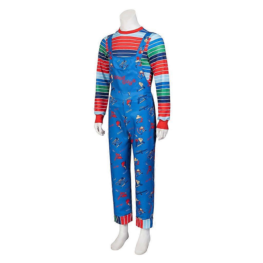 Get ready to terrify and thrill as Chucky, the infamous killer doll from Childs Play! This mens adult-sized Chucky costume perfectly replicates the eerie charm of the Good Guys doll, featuring a striped long-sleeve shirt and blue overalls adorned with toy-themed prints. Whether you're dressing up for Halloween, horror conventions, themed parties, or cosplay events, this outfit will make sure all eyes are on youjust like in the movies! Product Features: Authentic Horror Design Faithfully recreates Chuckys signature Good Guys doll outfit, down to the smallest details. Premium Material Made from high-quality polyester, ensuring comfort, breathability, and durability for extended wear. Intricate Details Features bold printed graphics, vibrant colors, and signature red accents for an eye-catching, sinister look. Versatile & Comfortable Ideal for cosplay events, horror-themed parties, Halloween, and performances. Easy to Wear Lightweight and designed for all-day comfort, so you can creep around in style. Available Sizes (Mens Sizing): S / M / L / XL / XXL (Check the size chart before ordering.)