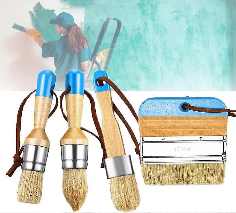 [4 Piece Chalk And Wax Brush Set ]Our chalk and wax brush set includes 1 piece of 1 inch flat brush, 1 piece of 1 inch pointed brush and 1 piece of 1 inch round brush, 1 piece of 4 inch flat brush; 4pcs chalk and wax brush set can meet most of your artistic needs. [Durable bristles]The chalk and wax brush set is made of bristles, strong and flexible, which can better control each brush stroke. It can also be used in conjunction with most paint colors and waxes to coat those hard-to-reach surfaces. [Comfortable Grip]The handle of these chalk and wax brushes are made of solid wood, ergonomically designed, comfortable grip, easy to grip, with a convenient thumb tip, which is very suitable for your hands. Allows you to easily control the painting strokes. [Convenient Design]Our chalk and wax brush set is equipped with a leather lanyard, which helps you hang after use, facilitate storage and dry quickly after washing, and provide you with convenient tools. [Widely Application]Our chalk and wax brush set is suitable for most surfaces, such as furniture, tables, chairs, cabinets, dressing tables, upholstery, walls, ceilings, etc. They are compatible with most whitewash paints and latex paints. Specifications: Name: chalk and wax brush set Material: Bristles and Wood Handle Size information: Flat brushes: Approx. 6.3 x 1.1 inches (L*W) Pointed brushes: Approx. 6.7 x 1.2 inches (L*W) Round brushes: Approx. 6.7 x 1.2 inches (L*W) Wide flat brushes: Approx. 4.7 x 3.9 inches (L*W) color: blue Size: 125.8x Package: 1 x Flat end chalk and wax brush 1 x Pointed end chalk and wax brush 1 x Round end chalk and wax brush 1 x Wide Flat end chalk and wax brush