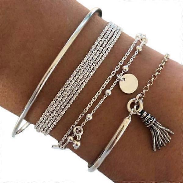 4 pcs Silver Bracelet/Bangle with Twisted Chains, Tassel and Beads - Women's Jewelry
