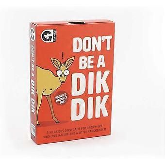 NATURE'S NAUGHTY SIDE - A GAME FOR GROWN UPS: Get Grandma laughing and all the family too with Don't Be A Dik Dik, a hilarious card game for adults who love nature and a little naughtiness. For ages 16 and up and for around 3 to 6 players, this is an excellent game of strategy and humour. Gameplay is around 15 to 20 minutes. SILLY NAME MATCHING GAME OF PAIRS: Go around the group asking for a card from your hand so you get a pair. The funniest card game ever will ask you for a GIANT BEAVER or a NIPPLEWORT to complete your pair and after each turn pass a card over to your left. The aim of the game is to make sure you don't end up with the Dik Dik DON'T BE LEFT WITH THE DIK DIK: Get rid of all your cards by collecting and passing wisely. After all the cards have passed through the players, if you are the last one left with the Dik Dik, you lose