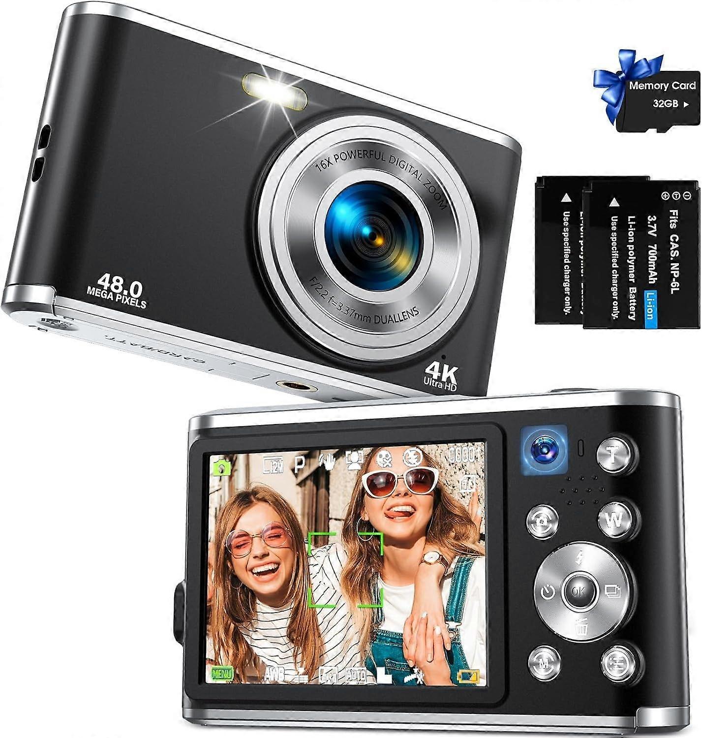 [48 MP & FHD 4K Digital Camera]- The digital camera supports high-quality 48MP photos and 4K HD video recording. Advanced CMOS technology ensures precise details, capturing vivid moments and leaving you with an unforgettable experience. The 16x digital zoom point-and-shoot camera with 32GB TF card is perfect for beginners to capture distant scenery.[Autofocus Dual Camera]- Innovative dual camera design! Switch to the front camera for easy selfies with just one click, and take advantage of the rear camera for creative videos, easily unlocking a variety of shooting techniques. The compact digital camera supports powerful focus function, which ensures precise focus of the front and rear lenses, allowing you to easily capture clear and wonderful moments. Our 4k autofocus digital camera is perfect as a Christmas or birthday gift! [Pause Function]- This video blog camera supports video mode, built-in microphone and anti-shake function, and can be connected to a computer via a USB data cable and used as a webcam for video calls and live broadcasts, so that you can share wonderful moments to social media. The YouTube vlog camera has an excellent pause function, which allows you to pause while recording or playing vlogs, saving you time in editing videos.[2.8-inch IPS Screen & Portable Camera]- The travel digital camera is smaller and lighter than a mobile phone and can easily fit into your pocket. The 2.8-inch IPS screen small digital camera is equipped with two 700mAh large-capacity batteries, which has a longer battery life and allows you to replace the battery at any time to continue shooting. This portable mini digital camera is perfect for recording happy times with friends, family, indoors/outdoors.