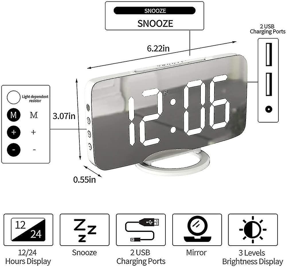 Digital Alarm Clock, Large Mirrored Led Display, With Usb Charger, Snooze Function Dim Mode Wall Hanging Beside Desk Clock For Bedroom White