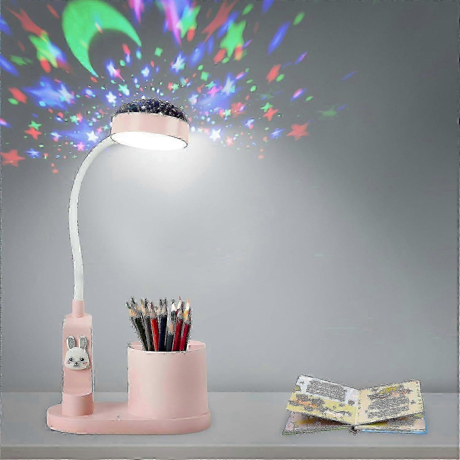 STARS PROJECTORThis kid's desk lamp with stars projector brings a magical and dreamy world to your child's bedroom, creating a relaxing and cozy atmosphere. With a long press on the button, you can easily switch on or off the projection modes, and watch the stars and moons change colors on the walls and ceiling. Perfect for inspiring your child's imagination.EYE PROTECTION & MATERIAL SAFETYThe LED desk lamp for kids is designed with eye protection in mind. It emits a pleasant and bright light without any blinking, dizziness, or shadows, reducing eye strain and avoiding fatigue. The rabbit head decoration adds a touch of fun and is made from high-quality ABS and PP material for long-lasting durability.2000mAh RECHARGEABLE The built-in 2000 mAh rechargeable battery allows for wireless use and easy transportation to the bedroom or study. Equipped with 360 flexible and rechargeable gooseneck, this girls and boys desk lamp is easy to adjust to any angle or position.3 BRIGHTNESS ADJUSTABLEThis children's desk lamp has three adjustable brightness levels to match any environment. You can easily set the desired brightness level with the simple switch.PACKAGEDesigned with a pen holder to hold school items such as pens or small gadgets, making the children's desk more organised. Features:-Children's desk lamp above projects a large area, causing the color-changing stars and moon to appear on the walls and ceiling.-Made of high quality ABS and PP material, strong and sturdy.-The table lamp emits comfortable and bright light, which makes people not feel uncomfortable, avoiding eye fatigue and reducing eye pressure.-The night light color of the children's desk lamp is warm white light. Has 3 brightness levels. -Equipped with a 360 adjustable goose neck, which allows you to keep the light where you want it.-The built-in 2000mAh battery can be used for flexible placement and use in different scenarios.-With a pen holder, organize various stationery. Like pens or some gadgets to make the kids desk more clutter free.Specification:Material: ABS+PC+silicone+electronic componentsSize: 121* 120*97mmBattery capacity: 3.7V2000mAhCharging time: 60 minutesPower: 5WLight color: white lightColor: pink Package Included:1x Desk lamp1x USB charging cable1x ManualNote:1. Please allow 1-3cm (0.4-1.18") difference due to manual measurement and slight color variation for different display setting.2. Due to the light and screen difference, the item's color may be slightly different from the pictures. Please understand.
