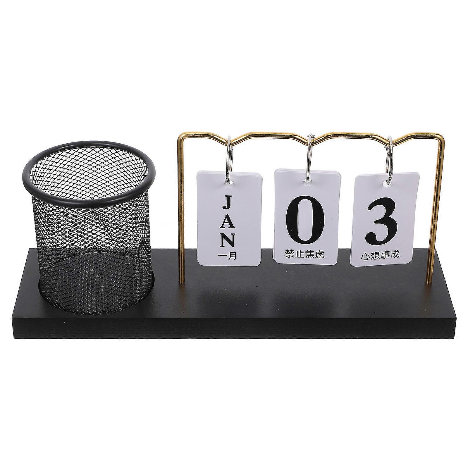 Desk Perpetual Flip Calendar Wooden Pen Cup Holder 3Pcs Multifunctional