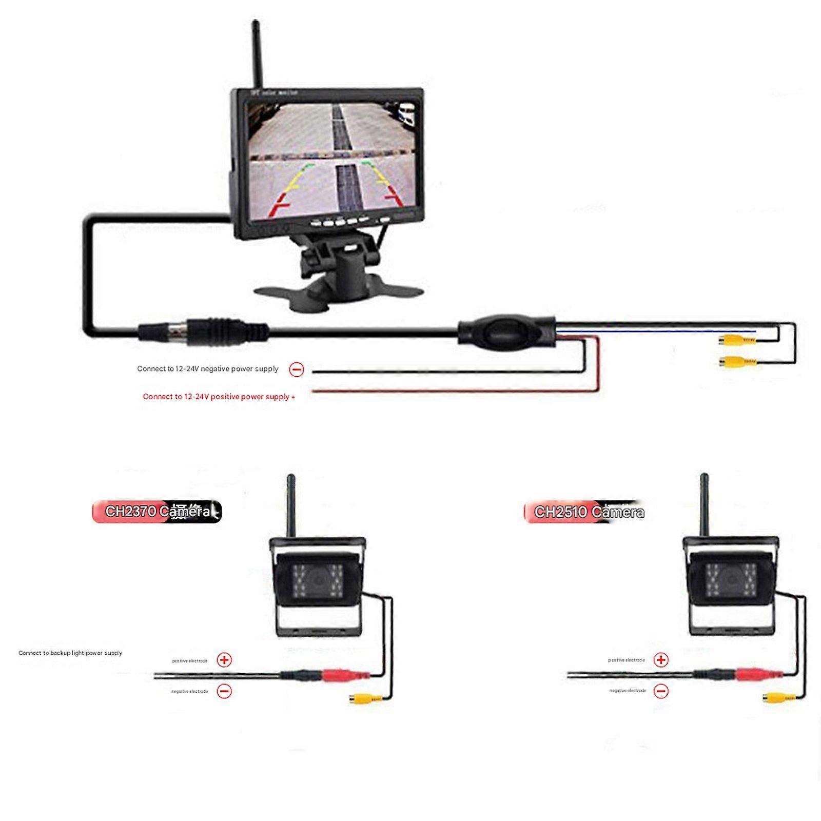 Features: * This is a professionally designed system with industrial leading components/parts. High quality and reliable * 7 inches HD TFT LCD widescreen monitor with built-in wireless receiver for RV Truck * The colour camera has a viewing angle of 120 degrees. Camera is water proof. * Rearview night vision IR reverse camera has 18 individual infrared (IR) LED, 10m effective range, helping your view still clearly at night or in bad weather * Waterproof camera body with a sun-visor and metal bracket. Easy to mount on any flat surface of the vehicle. * Hard metal cased camera, IP 67 waterproof grade, waterproof and mud proof * Easy to install and operate * Comes with mounting bracket for easy installation * Remote control is powered by button cell (Battery is not included) * 100% Brand New and High Quality * Rear view camera turns on automatically when vehicle is put on reverse gear. You can also turn it on while driving by pressing the button on the monitor - great feature for driving large vehicles. * 12V-24V DC power input range to fit most medium to large vehicles on the road. Specifications: 7 inches Monitor * Display Screen: 7 inches 16:9 * Operating Voltage: 12V/24V DC * Power: 8.64W * Transmission Distance: 15 meters * Compression Format: MPEG 4 video * Transmit Frequency: 18dBm * Transmission Speed: 12 Mbps * FHSS: Frequency Hopping Spread Spectrum * Hopping Rate: 1200/S * Resolution: 800RGB x480 dots * TV System: PAL / NTSC * Operating Temperature: -10~65 Back Up Camera * Backup Camera * backup line * Metal body with bracket for easy installation * Shell Material: Aluminum * Operating Voltage: 12/24V DC * Standard NTSC: 510 * 492 pixels, PAL: 510 * 582 pixels * View Angle: 120 * Resolution: 420 TVL * Lens: 2.5mm * Minimum Illumination: 0Lux (LED ON) * Infrared Light: 18pcs * Waterproof: IP67 * Operating Temperature: -20~70 Package included: 1 x 7in Car Monitor 1 x Backup Camera 1 x Holder 2 x Power Cable 1 x Remote Controller 1 x Instructions
