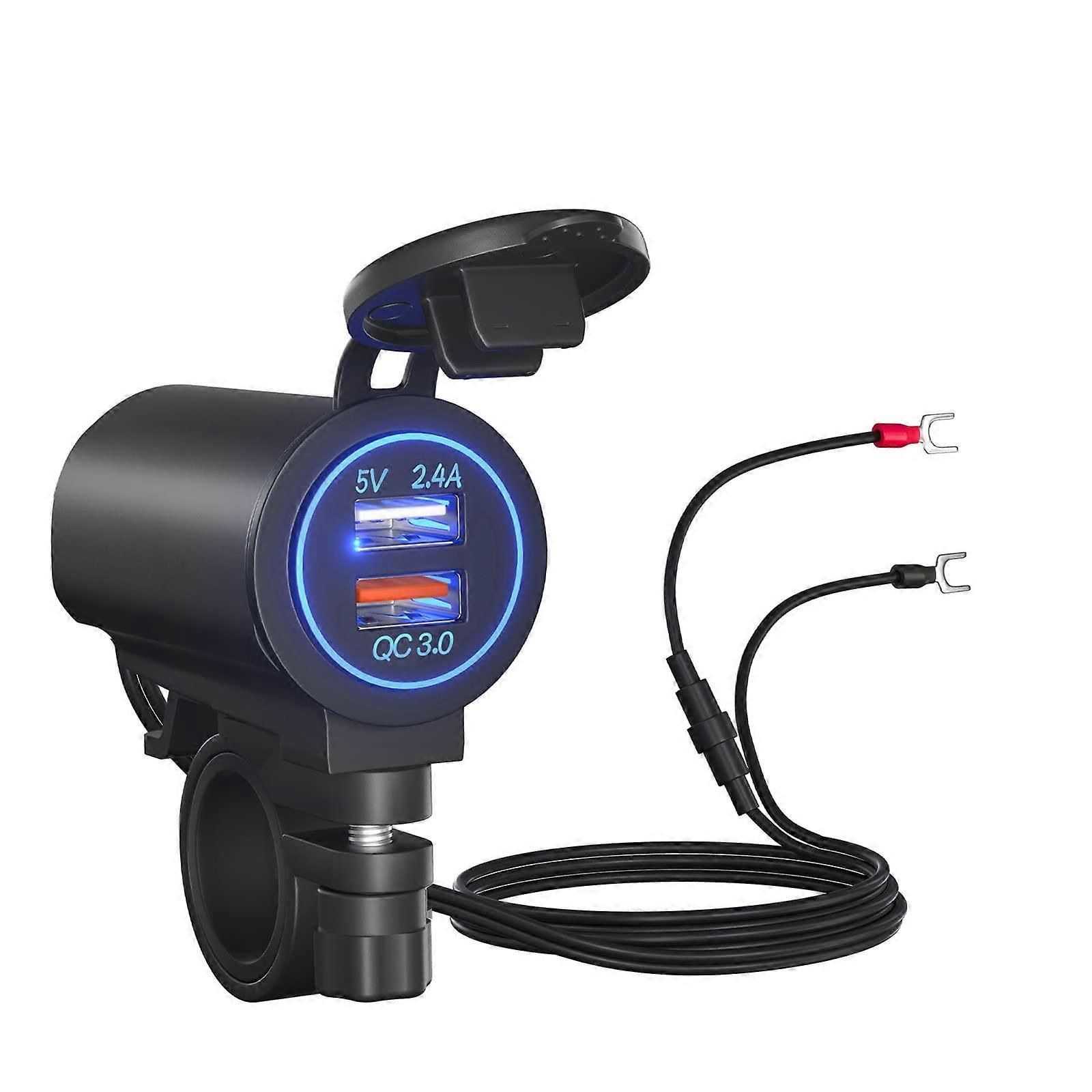 Dual USB Motorcycle Charger QC3.0 Waterproof with Blue Light for Motorcycle, Car, Boat, ATV, Bus