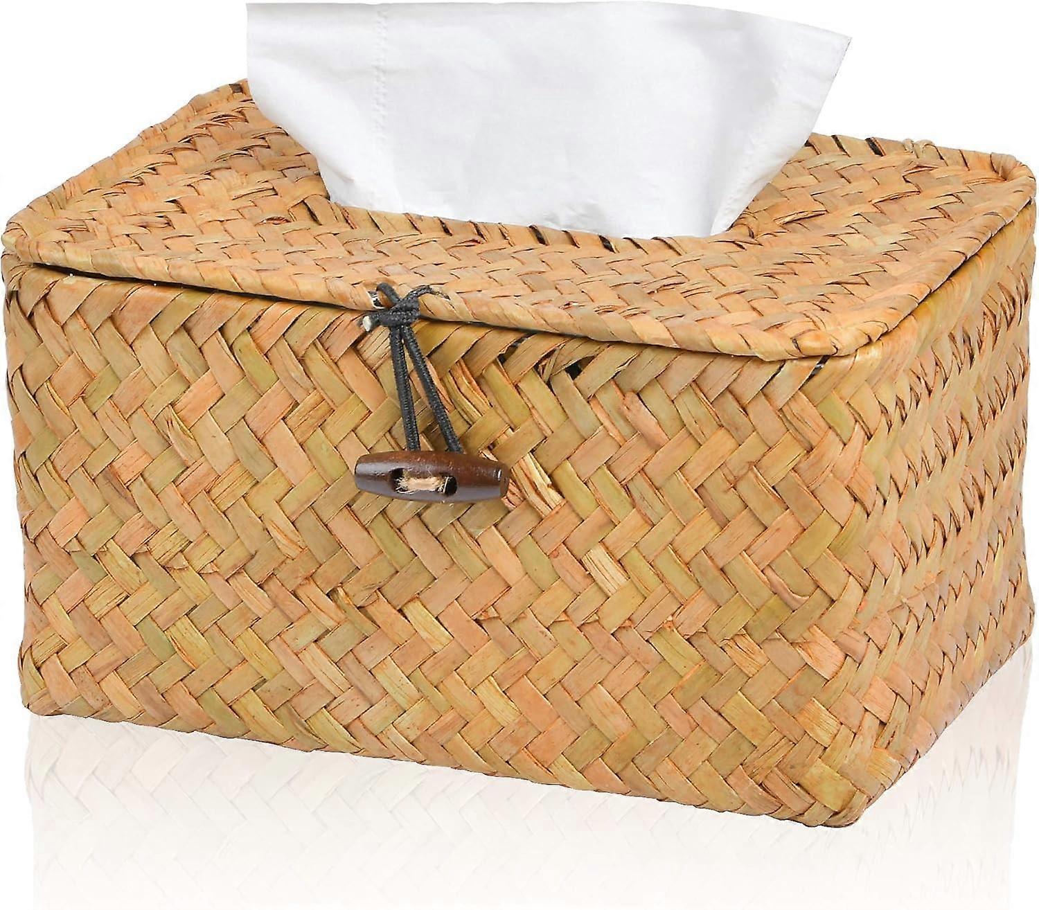 Durable Material: Made of quality natural seagrass knitting and with metal internal framework. Sturdy and not easily deformed. Easy to get tissues in and out. This tissue box holder has a little elastic loop button as the closure and with the bottom that can move around without holding on the tissue box. Simple yet nice looking decorative touch for adding texture to your room. Lightweight but weighted enough to pullout a tissue no lift up. Designed for most standard tissue box. Also can use for store little things inside. The woven grass look perfect for bathroom, living room, even office. Dimensions 7.2"(Length)x4.8"(Width)x3.8"(Height). Package: 1*Rectangular Tissue Box Cover