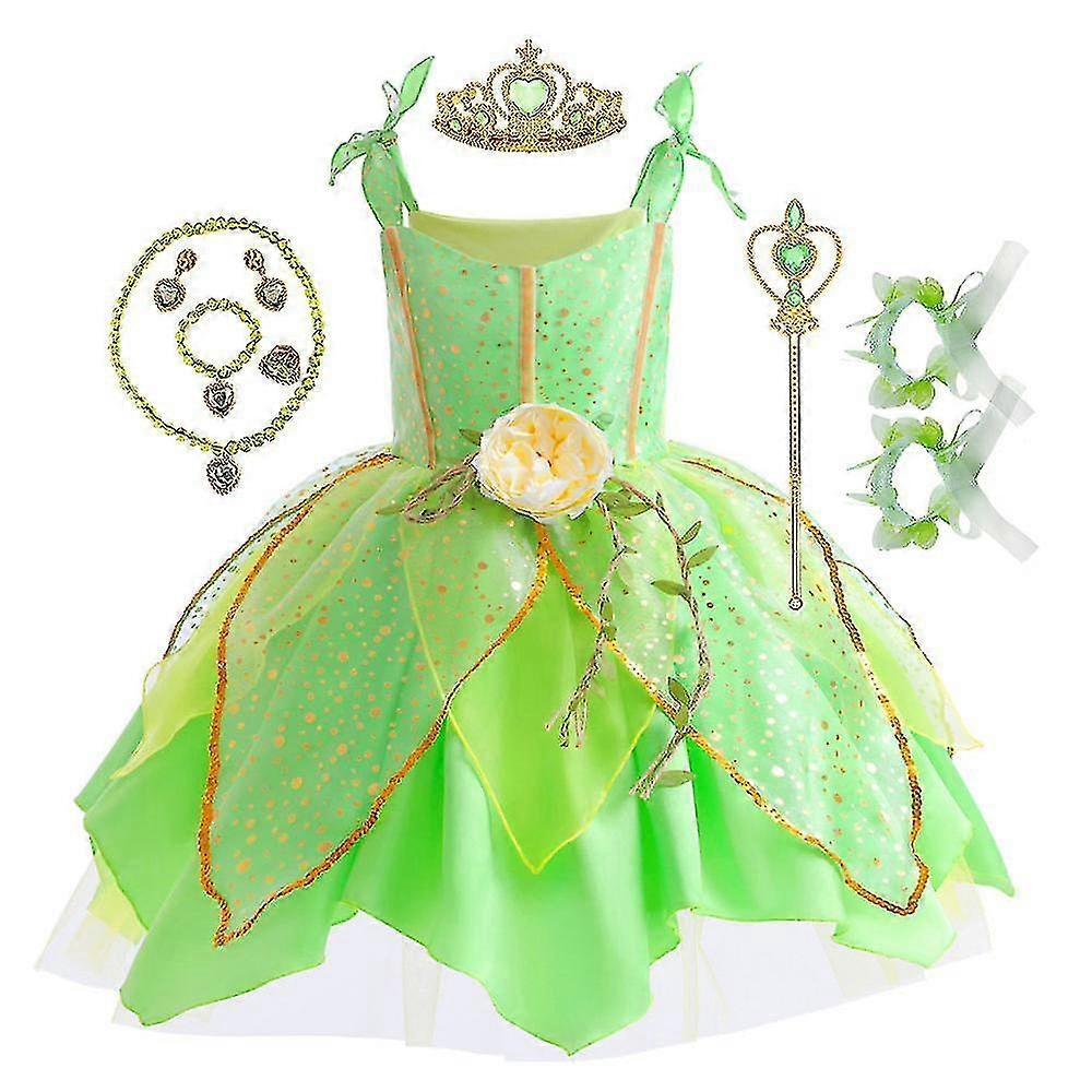 Tinker Bell Fairy Dress Halloween Cosplay Costume Girls Green Fairy Tinker Bell's Green Princess Dress With Crown Necklace Hand Flower