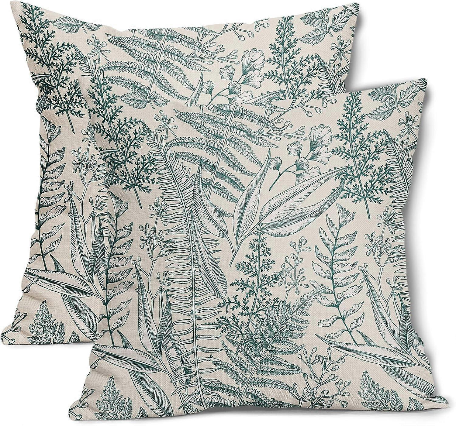 Teal Leaf Plant Pillow Covers 20X20 Inch Herbs Botanical Fern Vintage Leaves Floral Decorative Pillow Cases Set of 2 Cotton Linen Throw Pillows Farmho