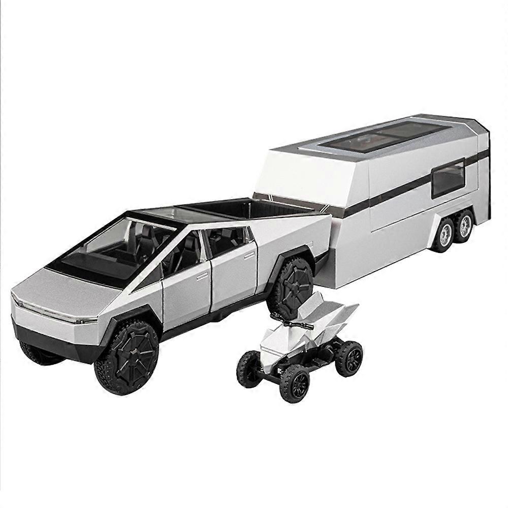 Tesla Cybertruck Pickup Trailer RV Model with Off-Road Motorcycle Realistic Alloy Car Model Set